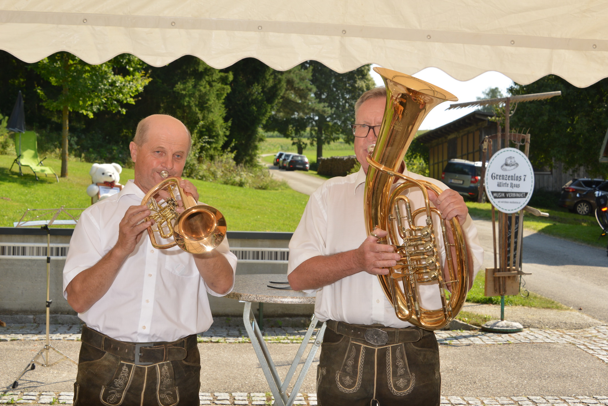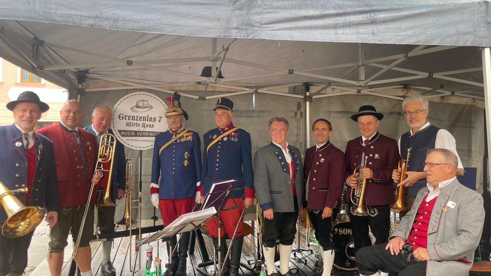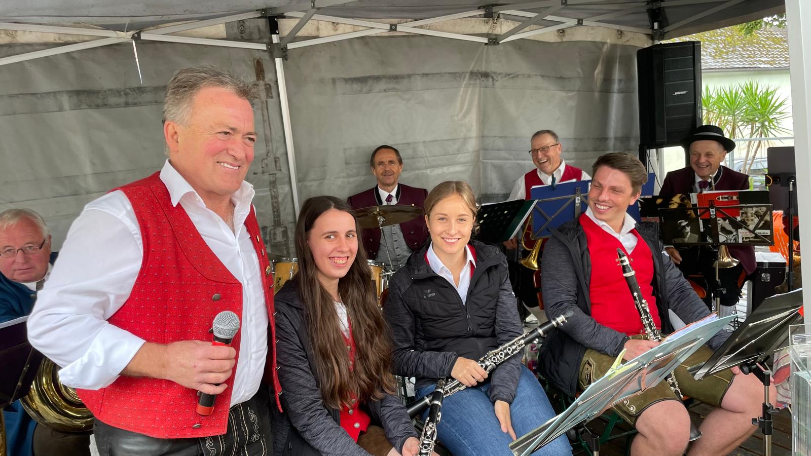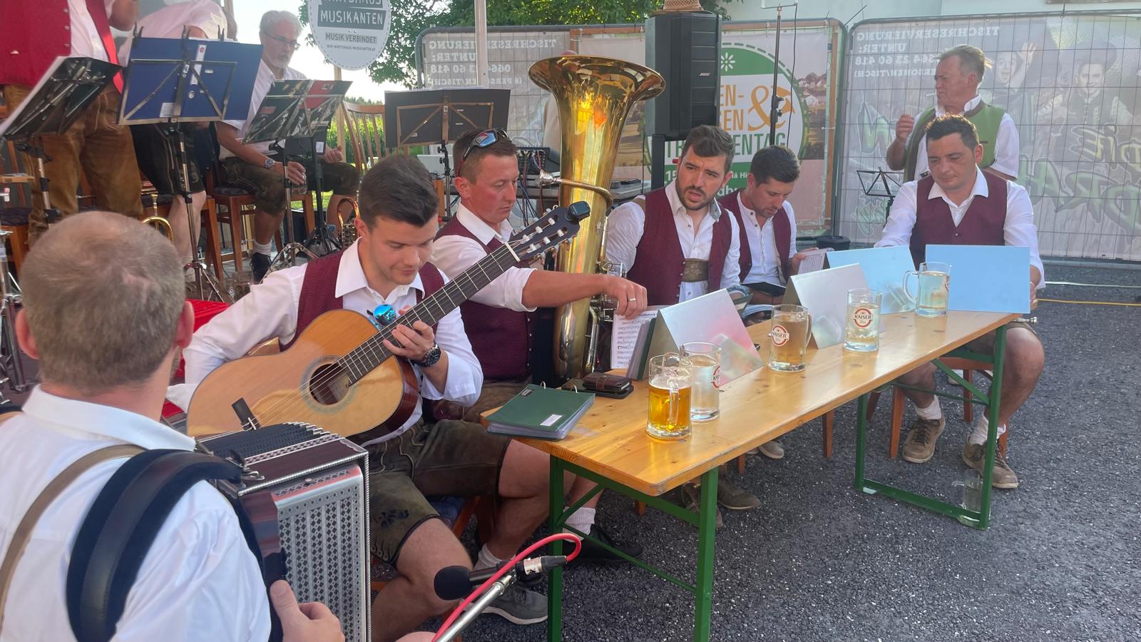 Nach vielen Proben in den 7 verschiedenen Musikheimen begann die Wirteroas 2024 mit einem Frühschoppen am Sonntag, 16.6., beim Partnerschaftsfest im Pfarrgarten Waldburg. Klarinettenstimmen werden bei Grenzenlos 7 normalerweise vom hohen Blech übernommen, bei diesem Frühschoppen wurden wir von 2 Musikern der Partnerschaftskapelle unterstückt.