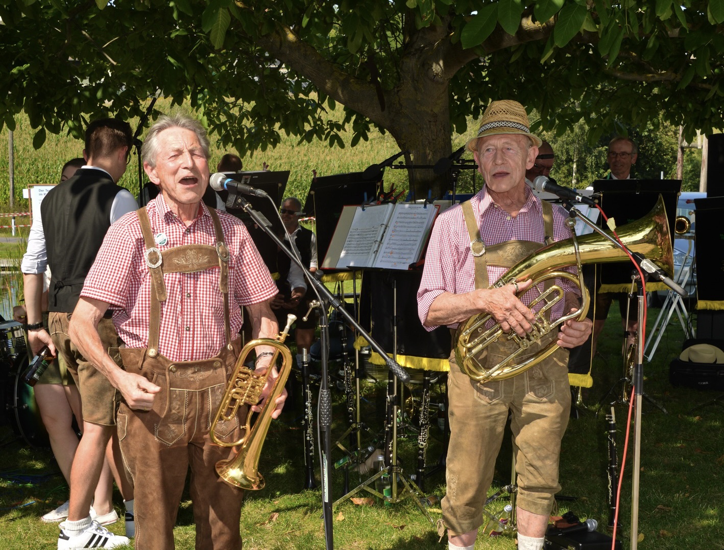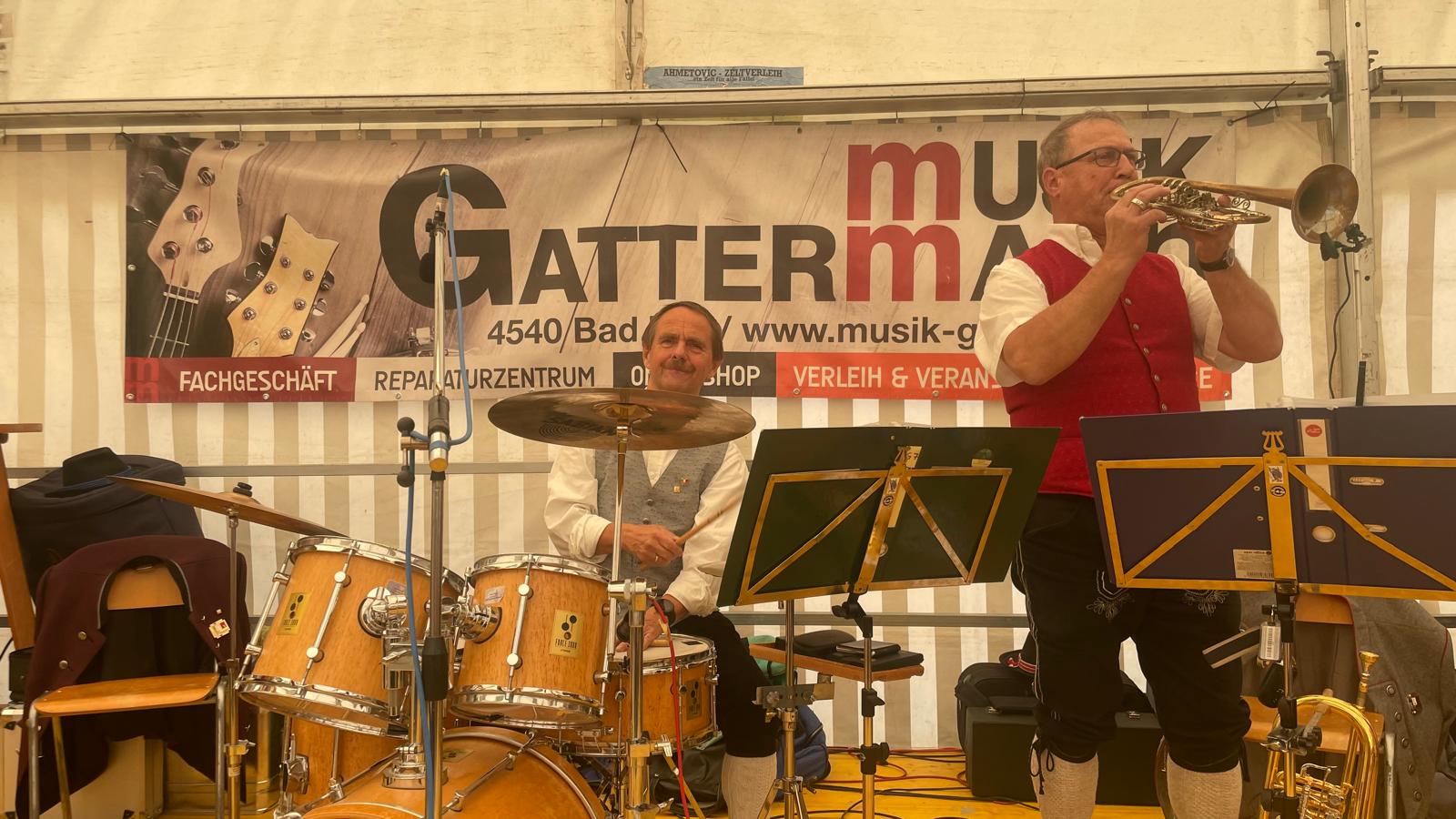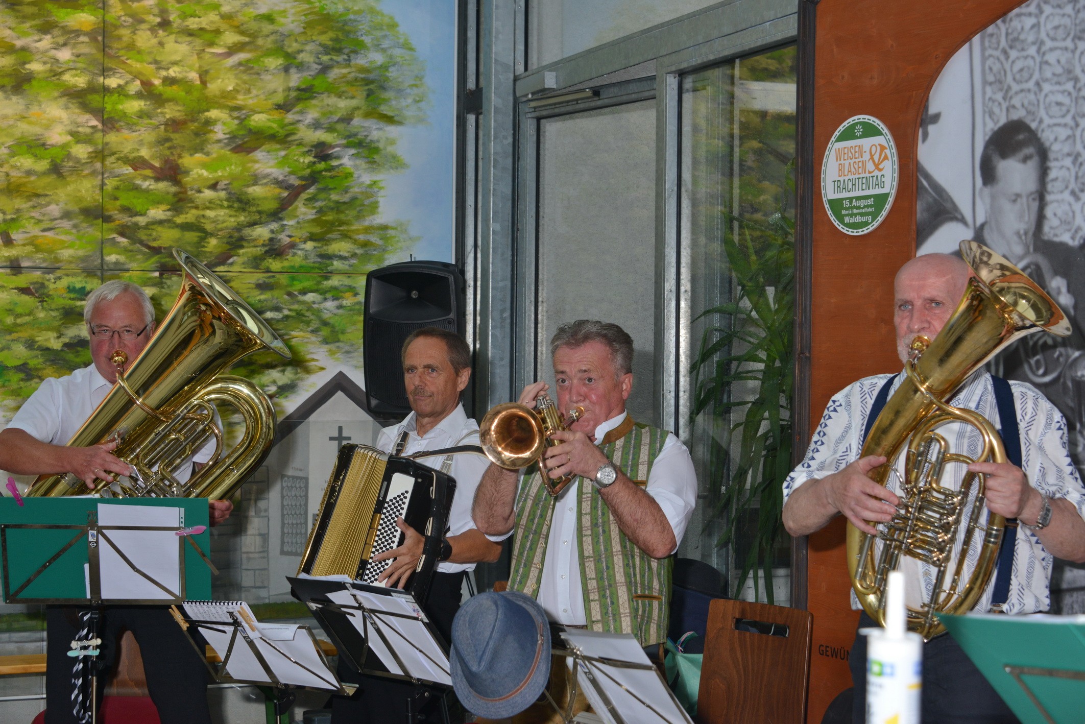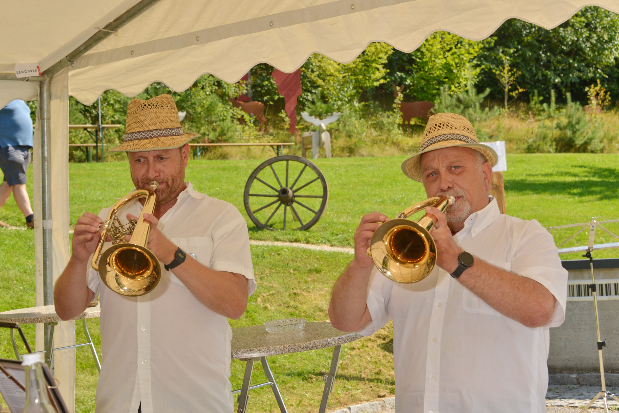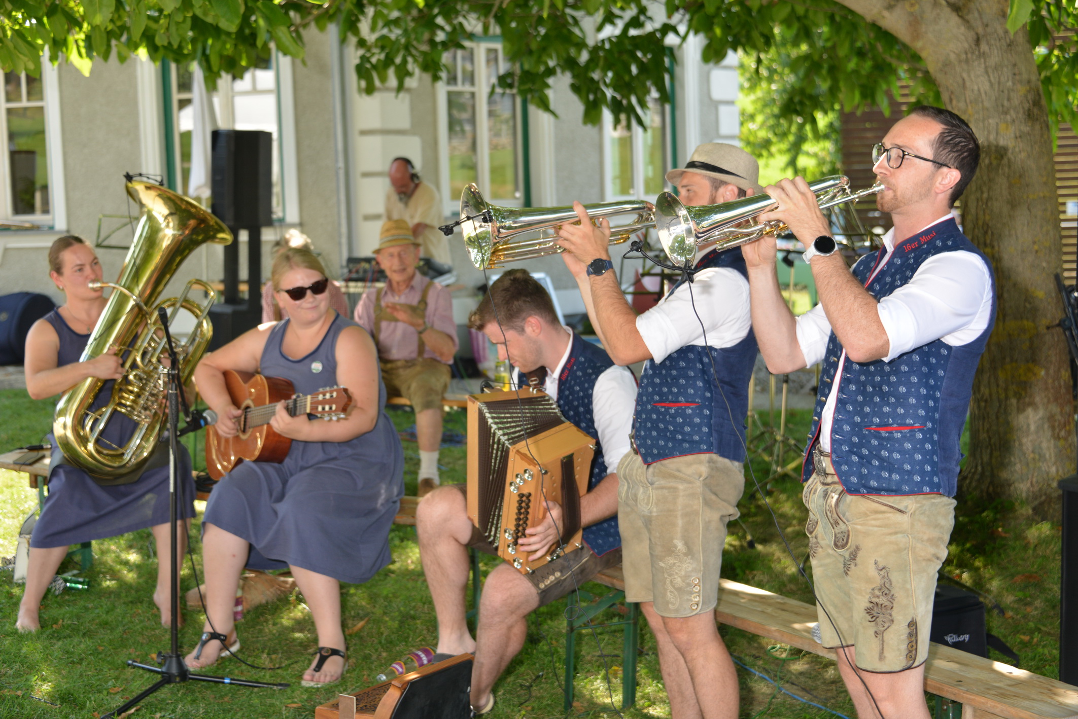 Nach vielen Proben in den 7 verschiedenen Musikheimen begann die Wirteroas 2024 mit einem Frühschoppen am Sonntag, 16.6., beim Partnerschaftsfest im Pfarrgarten Waldburg. Klarinettenstimmen werden bei Grenzenlos 7 normalerweise vom hohen Blech übernommen, bei diesem Frühschoppen wurden wir von 2 Musikern der Partnerschaftskapelle unterstückt.